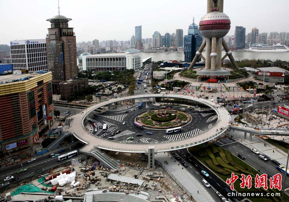 位于上海浦東陸家嘴中心地區(qū)的環(huán)形天橋——“明珠環(huán)”人行天橋基本建成,預計在世博會前正式投入啟用!懊髦榄h(huán)”毗鄰東方明珠廣播電視塔,圓周長370米,設(shè)4個出口,并配有步行樓梯、自動扶梯和殘疾人無障礙垂直電梯。它的建成已成為陸家嘴金融中心地區(qū)一大景觀。徐網(wǎng)林CFP
