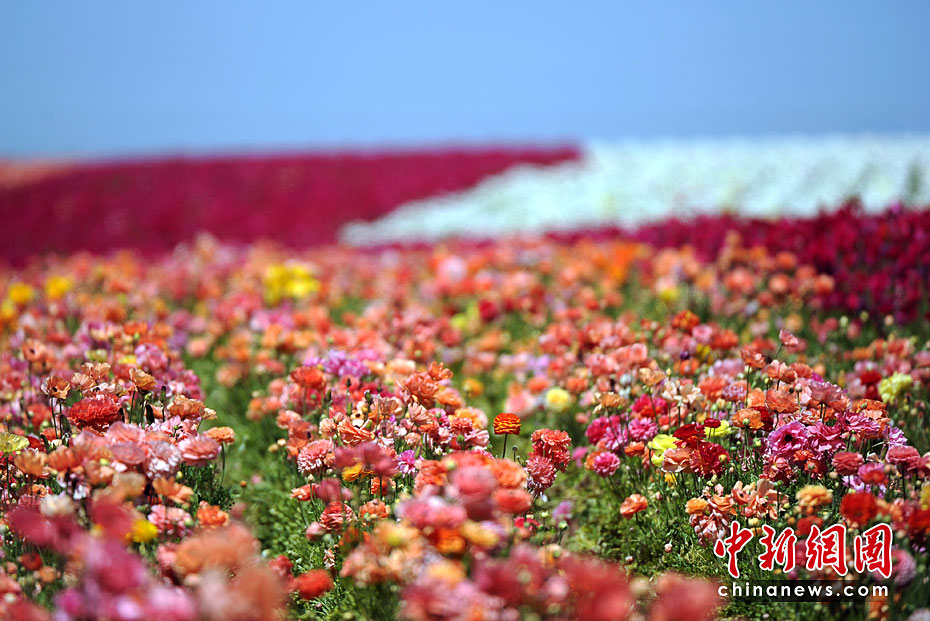 美國(guó)加利福尼亞州圣迭戈的卡爾斯巴德花田近日繁花盛開,姹紫嫣紅的花朵整齊地鋪滿在五十英畝的土地上,一望無垠的花海,美不勝收。圖片來源:中國(guó)新聞網(wǎng)