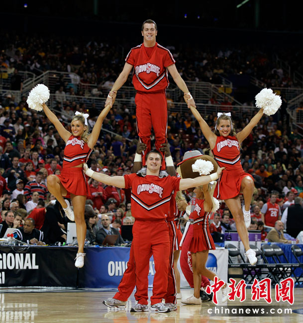 啦啦隊的歷史可追溯到原始部落時期,戰(zhàn)士們狩獵凱旋歸來時,人們給予歡呼及鼓勵的動作。最初的拉拉隊要追溯到19世紀(jì)80年代的美國大學(xué)校園,當(dāng)時的形式是在大學(xué)里的橄欖球賽上,一位領(lǐng)隊站在一大群人前面領(lǐng)導(dǎo)他們?yōu)樽约旱那蜿爡群爸。圖片來源:中國新聞網(wǎng)
