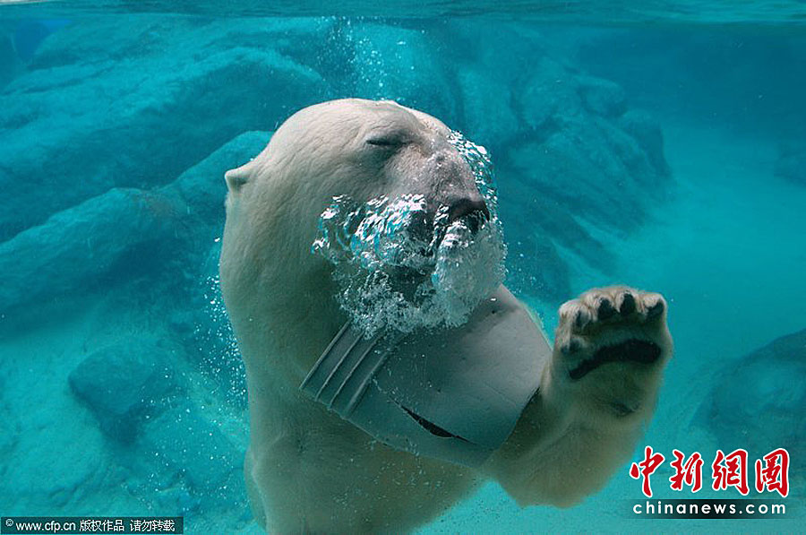 美國Asheboro北卡羅來納動(dòng)物園一頭名叫威利的北極熊可是個(gè)“活寶”。任何一個(gè)可用的東西都能成為它在鏡頭前“耍寶”的玩具。圖片來源:CFP