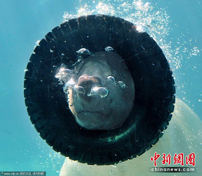 美國(guó)Asheboro北卡羅來(lái)納動(dòng)物園一頭名叫威利的北極熊可是個(gè)“活寶”。任何一個(gè)可用的東西都能成為它在鏡頭前“耍寶”的玩具。圖片來(lái)源:CFP