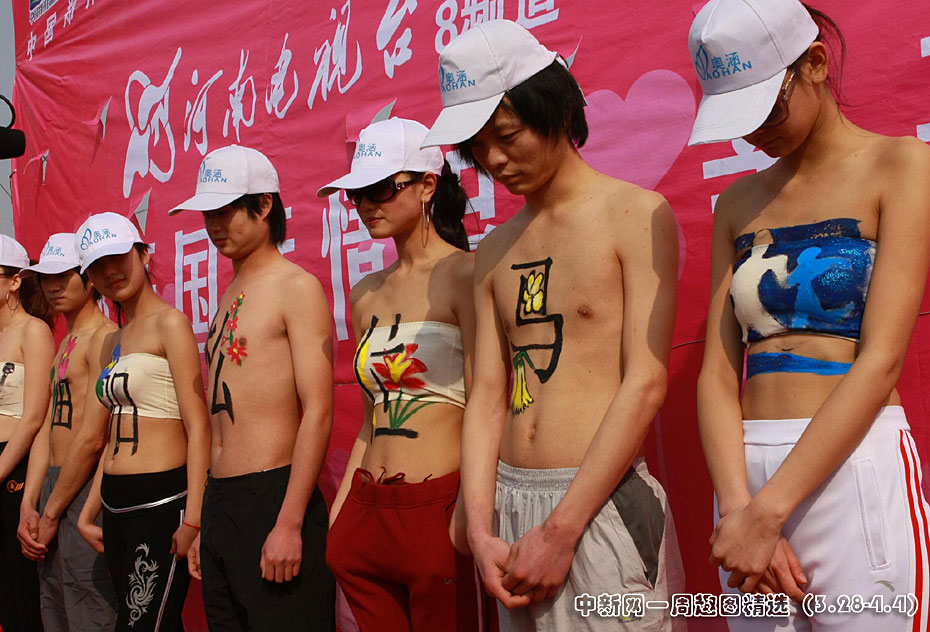 3月末,河南鄭州七位靚男俊女赤裸著上身,在胸前繪著“馬拉松加油”,背上寫著“幸福一條龍”為二零一零年中國鄭開國際馬拉松賽助興。圖片來源:中國新聞網(wǎng)>>點擊觀看詳細(xì)內(nèi)容