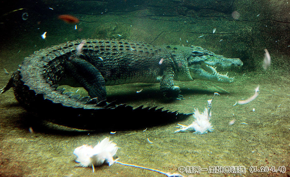 3月29日,澳大利亞悉尼野生動物園的一條鱷魚雷克斯正在享受它的美味——雞肉。圖片來源:中國新聞網(wǎng)>>點擊觀看詳細內(nèi)容