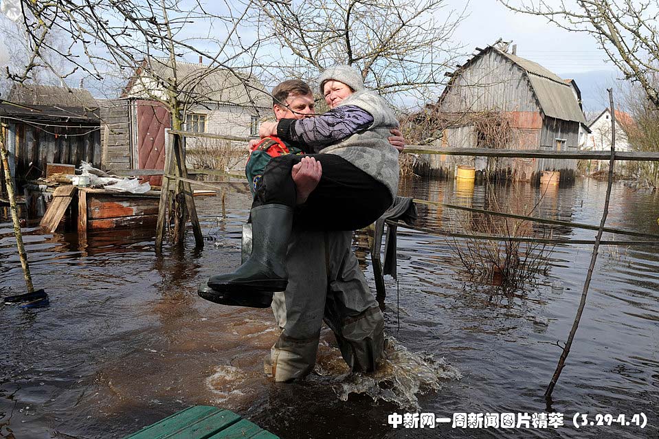 周二(30日),白俄羅斯冰雪融化導(dǎo)致河流泛濫。圖為人們逃離家園。