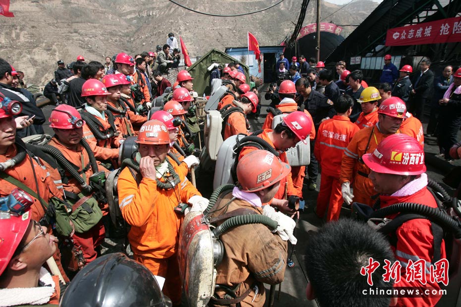 4月4日,華晉焦煤公司王家?guī)X礦透水事故第八天,搶險指揮部成三個搜救小分隊下井搜救井下被困礦工,與他們一同下井還有6名潛水員。中新社發(fā) 張云 攝