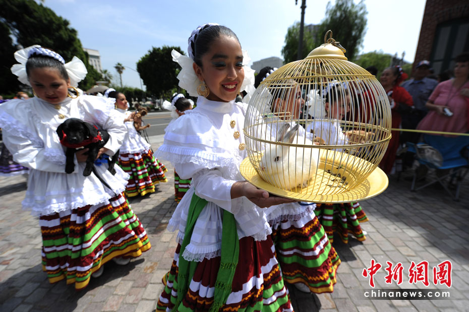 當(dāng)?shù)貢r間4月4日,美國洛杉磯人們在歡慶復(fù)活節(jié)的同時,也為他們的寵物舉行了祝福儀式。這項(xiàng)祝福儀式每年舉行一次。圖片來源:中國新聞網(wǎng)