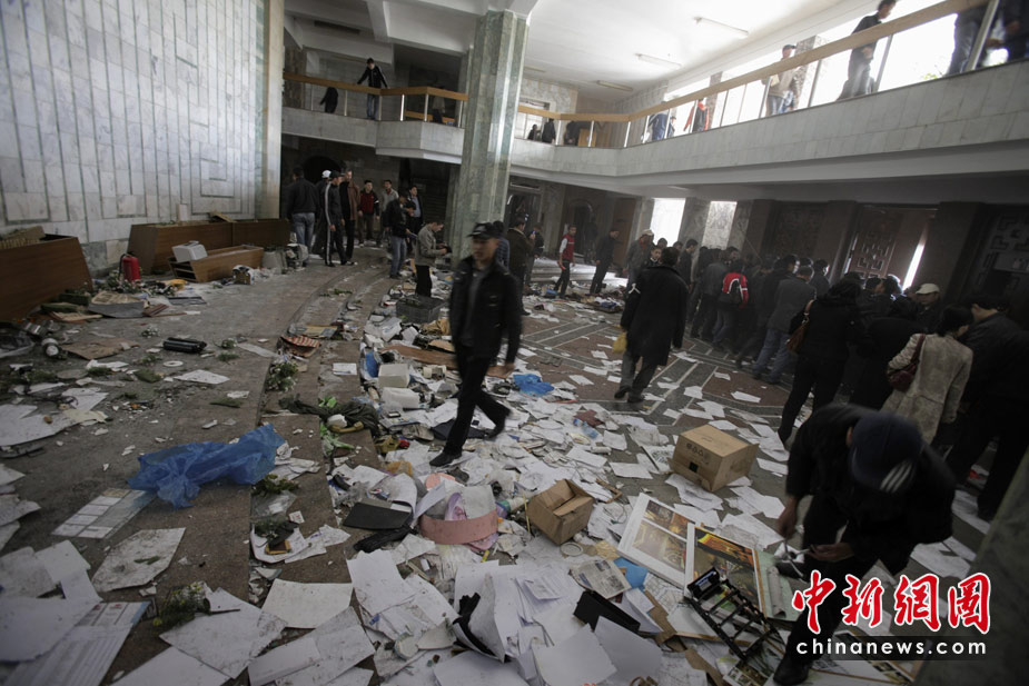 吉爾吉斯斯坦7日發(fā)生大規(guī)模騷亂,反對(duì)派示威者占領(lǐng)了議會(huì)大樓,8日,總統(tǒng)府也被示威者占領(lǐng)。圖為政府總部一片狼藉。