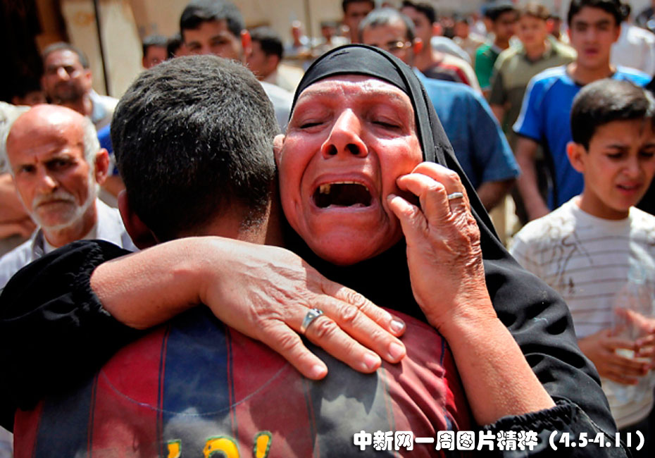 4月6日周二,一名女子在巴格達(dá)市中心的爆炸現(xiàn)場放聲痛哭。全城至少有五枚安放在公寓樓中的炸彈爆炸,還有一個市場也受到了炸彈的襲擊。