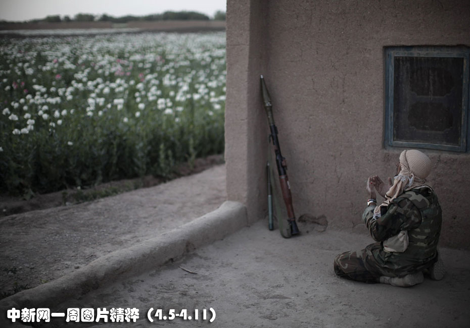4月5日周一,在阿富汗南部赫爾曼德省馬爾賈地區(qū)的一處塔利班據(jù)點(diǎn),一名與未攝入鏡頭的美國(guó)海軍陸戰(zhàn)隊(duì)士兵徒步巡邏的阿富汗國(guó)家安全部隊(duì)?wèi)?zhàn)士正在進(jìn)行禱告,他的面前是一大片盛開的罌粟花。