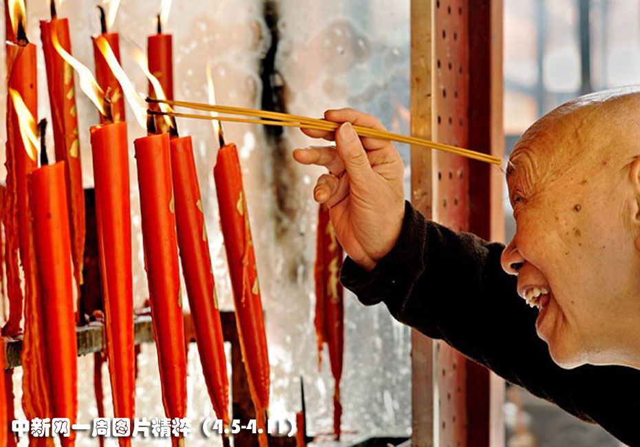 每年清明節(jié)時(shí),中國人會去墓地和寺廟焚香燒紙來表示對祖先的敬意。照片攝于4月5日周一,圖中這位上海老人正在寺廟里燒香祭祖。