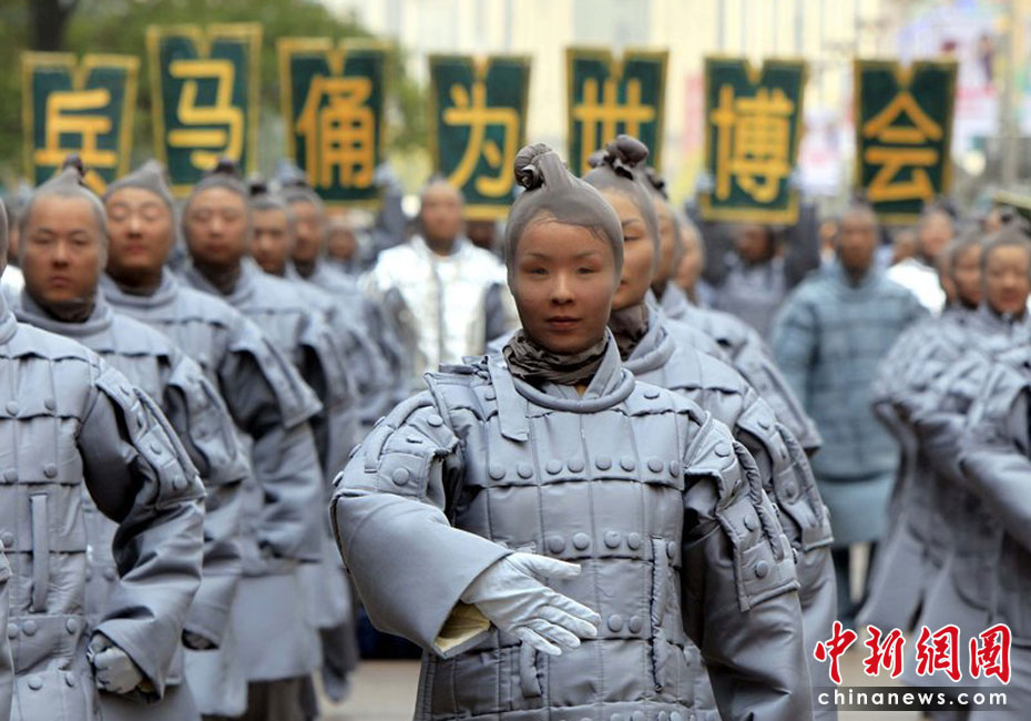 4月10日,由西安旅游局承辦的兵馬俑牽手上海世博會大型旅游宣傳咨詢活動舉行。來自兵馬俑故鄉(xiāng)的百人表演隊伍,身著灰色的兵馬俑服裝,以鏗鏘的節(jié)奏、雄壯的氣勢,在上海南京東路步行街和東方明珠廣場游演,吸引了大批市民及海內(nèi)外游客駐足觀看。文音/CFP