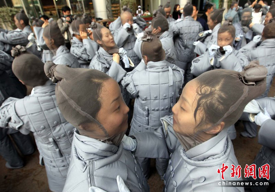 4月10日,由西安旅游局承辦的兵馬俑牽手上海世博會(huì)大型旅游宣傳咨詢活動(dòng)舉行。來(lái)自兵馬俑故鄉(xiāng)的百人表演隊(duì)伍,身著灰色的兵馬俑服裝,以鏗鏘的節(jié)奏、雄壯的氣勢(shì),在上海南京東路步行街和東方明珠廣場(chǎng)游演,吸引了大批市民及海內(nèi)外游客駐足觀看。文音/CFP