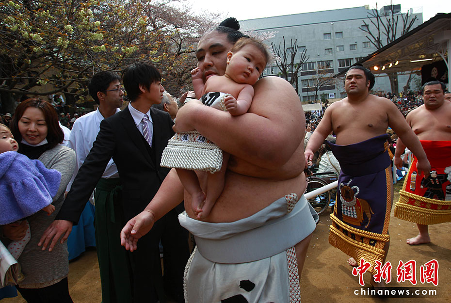 4月9日,來自世界各地的相撲選手齊聚日本東京靖國神社內(nèi)的相撲館參加為期一天的日本供奉大相撲比賽。圖片來源:中國新聞網(wǎng)