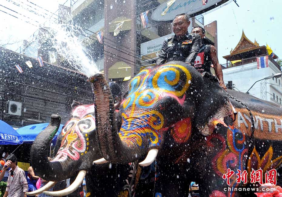 4月12日,泰國迎來一年一度的潑水節(jié),在拷桑路旅游區(qū)人們用水槍與大象“互噴”希望為對(duì)方送上祝福同時(shí)慶祝泰國新年。圖片來源:中國新聞網(wǎng)