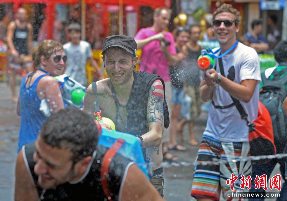 4月12日,泰國迎來一年一度的潑水節(jié),在拷桑路旅游區(qū)人們用水槍與大象“互噴”希望為對方送上祝福同時慶祝泰國新年。圖片來源:中國新聞網(wǎng)