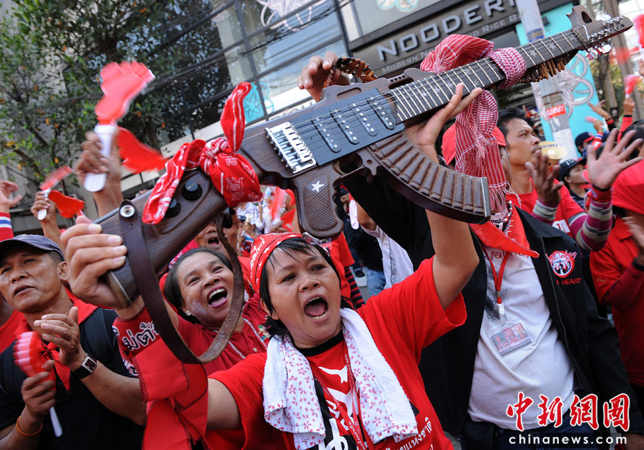 當(dāng)?shù)貢r間4月12日,泰國紅衫軍在曼谷市區(qū)抬著棺材舉行游行,借此向政府施壓促阿披實下臺。此前紅衫軍示威者與軍警發(fā)生沖突,造成21人死亡。圖片來源:中國新聞網(wǎng)