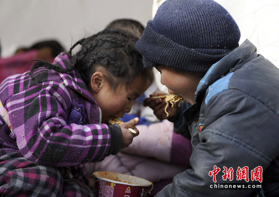 4月15日,青海玉樹(shù)縣體育場(chǎng)的地震災(zāi)民安置點(diǎn),兩名受災(zāi)孩童分食一盒方便面,一根不剩。中新社發(fā) 廖攀 攝