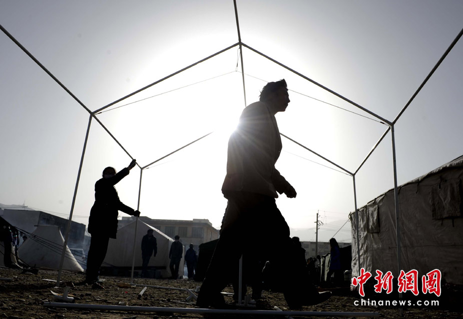 4月15日,青海玉樹縣體育場的地震災(zāi)民安置點內(nèi),玉樹地震災(zāi)民正在積極自建抗震帳篷。中新社發(fā) 廖攀 攝