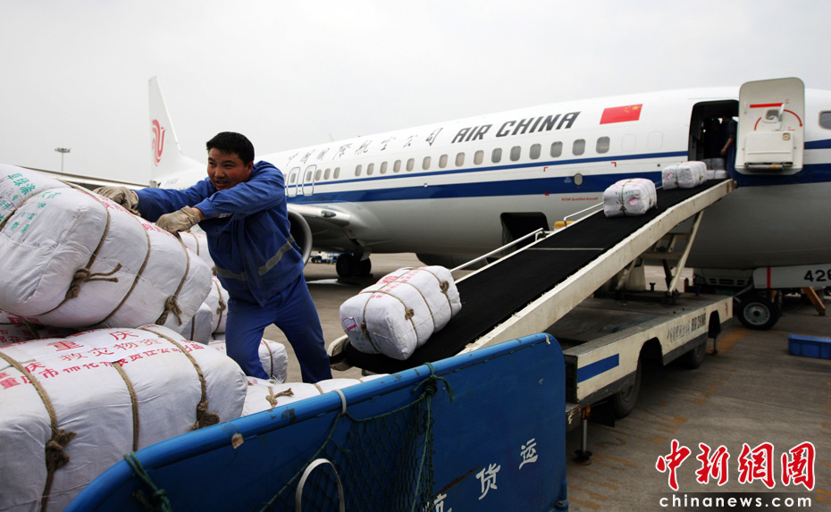 4月15日,重慶江北國(guó)際機(jī)場(chǎng)停機(jī)坪上,工人們緊張地將救援物資裝運(yùn)上飛機(jī)準(zhǔn)備起運(yùn)青海地震災(zāi)區(qū)。青海玉樹縣地震發(fā)生后,中共中央政治局委員、重慶市委書記薄熙來庚即作出重要批示,要求重慶全力以赴支援災(zāi)區(qū),根據(jù)災(zāi)區(qū)需求提供支援。中共重慶市委、市政府第一時(shí)間向青海省政府發(fā)去了慰問電,并支援災(zāi)區(qū)300萬元和大批救援物資,首批救援物資于當(dāng)日下去從重慶起飛空運(yùn)至災(zāi)區(qū)。中新社發(fā) 郭晉嘉 攝