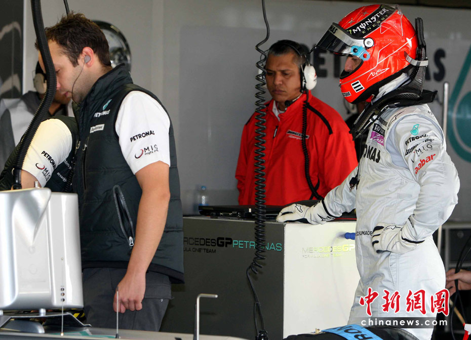 4月16日,2010國(guó)際汽聯(lián)F1世界錦標(biāo)賽上海站在上海國(guó)際賽車場(chǎng)開始車手第一、第二次練習(xí)賽。圖為代表梅賽德斯GP車隊(duì)出戰(zhàn)的老車王、德國(guó)車手舒馬赫重回上海賽道。 中新社記者 任晨鳴 攝
