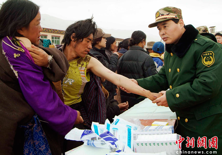 4月16日上午,廣東邊防總隊(duì)抗震救災(zāi)醫(yī)療隊(duì)在青海玉樹州結(jié)古鎮(zhèn)民族師范學(xué)院廣場設(shè)立救治點(diǎn),當(dāng)日救助地震災(zāi)區(qū)傷員200多名。中新社發(fā) 陳森陽 攝