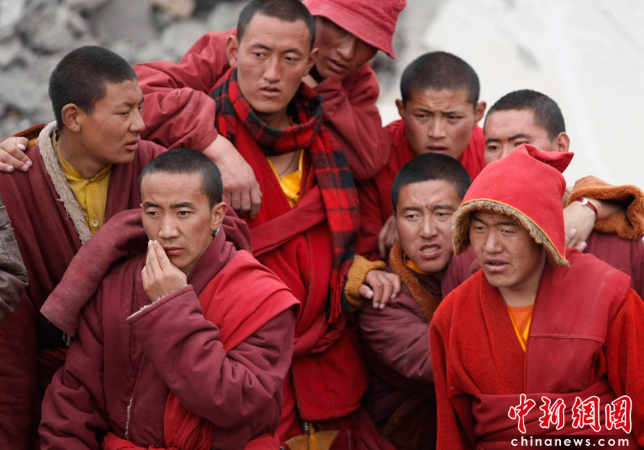 4月16日,青海玉樹結(jié)古鎮(zhèn)震災(zāi)救援現(xiàn)場,當(dāng)?shù)厣畟H在救援現(xiàn)場關(guān)注進(jìn)展情況。中新社發(fā) 盛佳鵬 攝