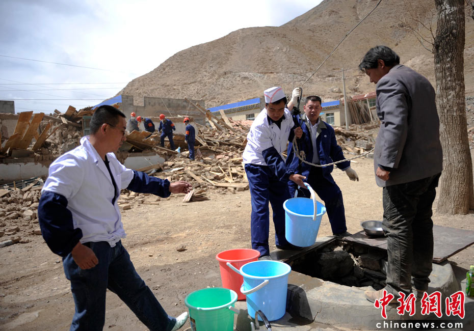 4月16日,青海玉樹(shù)民族綜合職業(yè)學(xué)校生活保障人員提取地下水飲用。中新社發(fā) 廖攀 攝