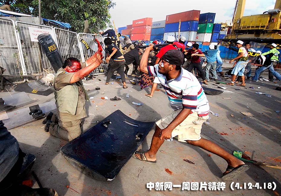 4月14日周三,在印度尼西亞首都雅加達,一名示威者在沖突中毆打一名警員。示威者手持砍刀和棍棒,抗議政府試圖拆除一名18世紀(jì)阿拉伯伊斯蘭傳教士的墳?zāi)埂?/p>