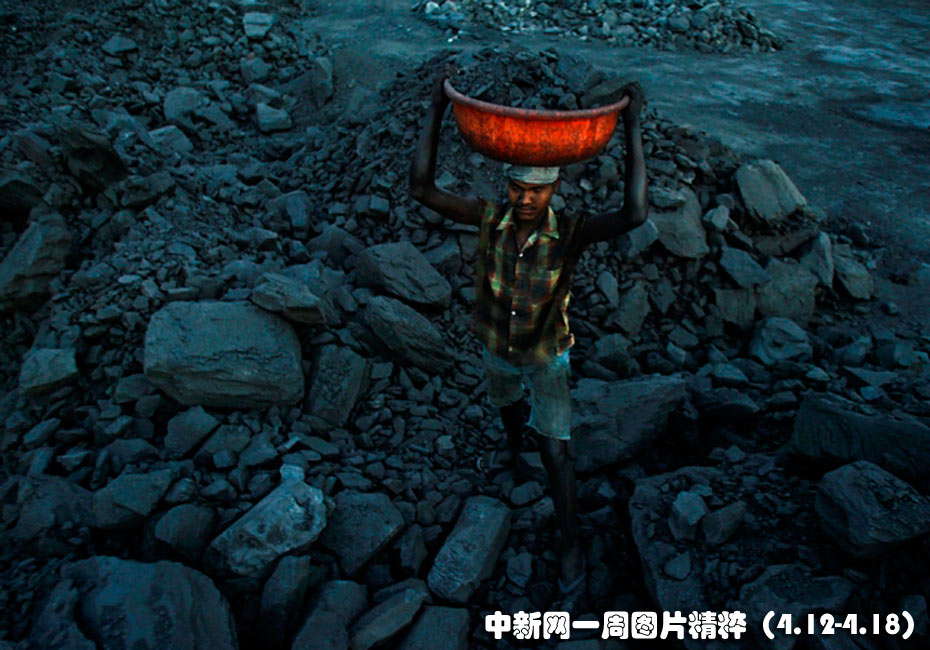 4月12日周一,在印度奧里薩邦的一座煤礦附近,一名工人正在搬運(yùn)煤炭。