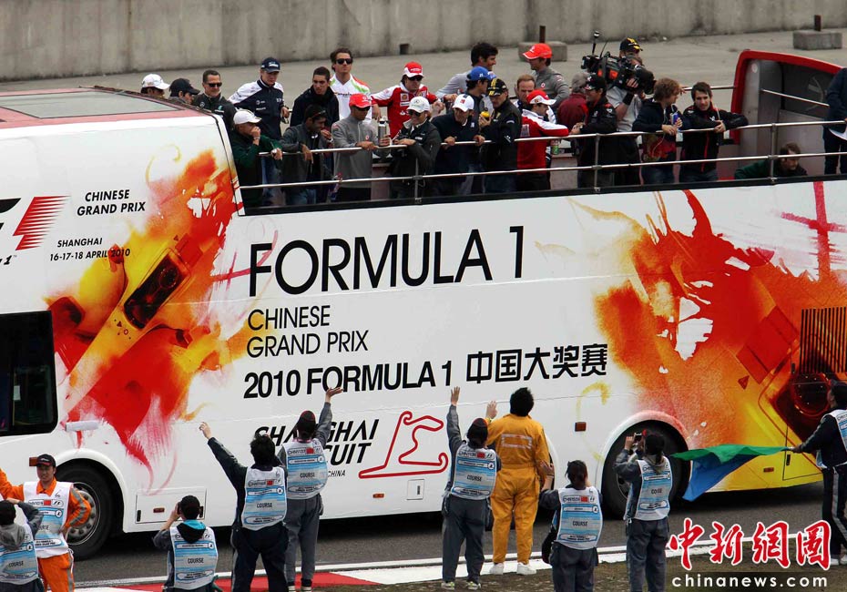 4月18日下午,2010國(guó)際汽聯(lián)F1世界錦標(biāo)賽上海站在上海國(guó)際賽車場(chǎng)舉行正式比賽,賽前24名參賽車手按照慣例乘坐敞篷車環(huán)繞賽場(chǎng)一周與車迷見(jiàn)面,但是寥寥無(wú)幾的觀眾與陰沉的天氣使上海F1賽事創(chuàng)下開(kāi)賽七年以來(lái)觀眾人數(shù)最低的紀(jì)錄。中新社記者 任晨鳴 攝