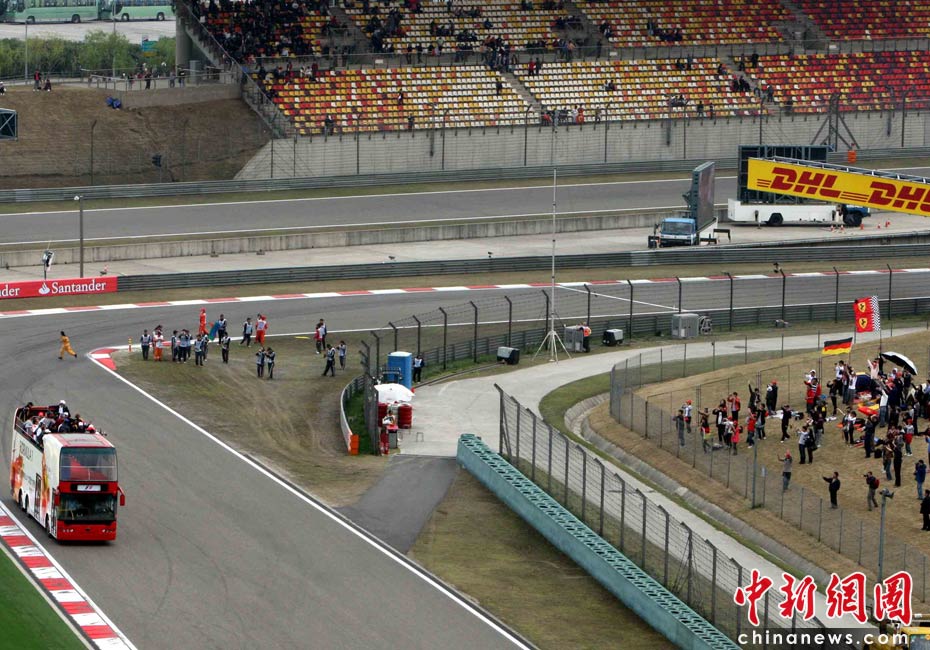 4月18日下午,2010國際汽聯(lián)F1世界錦標(biāo)賽上海站在上海國際賽車場舉行正式比賽,賽前24名參賽車手按照慣例乘坐敞篷車環(huán)繞賽場一周與車迷見面,但是寥寥無幾的觀眾與陰沉的天氣使上海F1賽事創(chuàng)下開賽七年以來觀眾人數(shù)最低的紀(jì)錄。中新社記者 任晨鳴 攝
