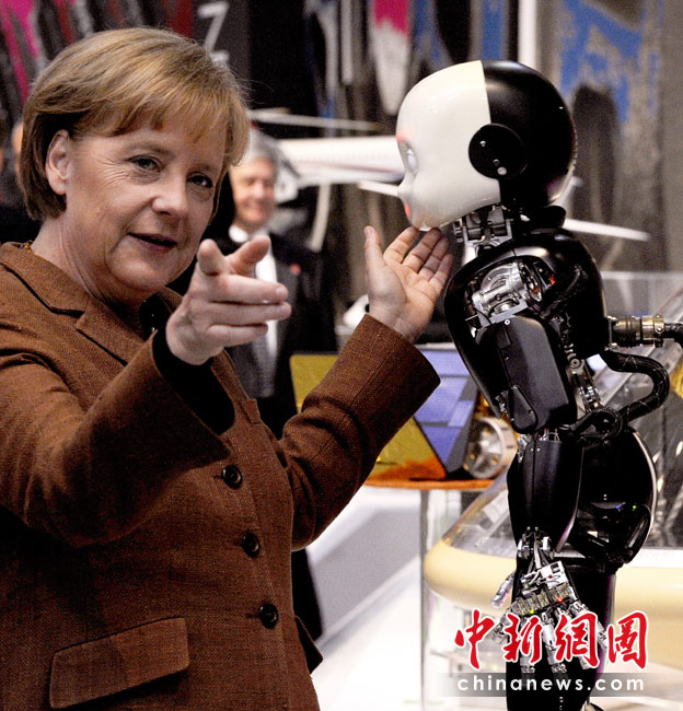 德總理工業(yè)博覽會上與機器人“逗樂”