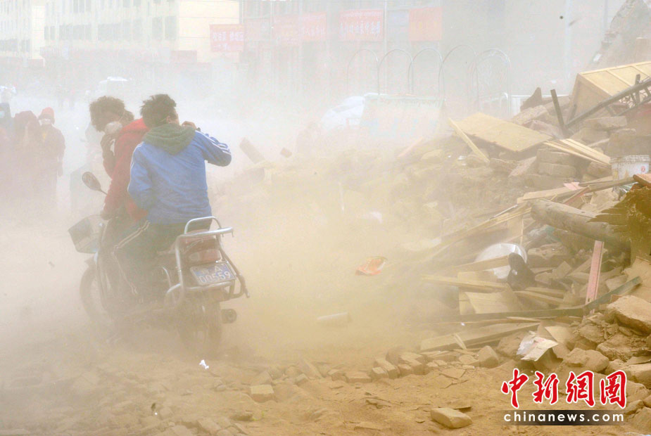 4月中旬青海玉樹地震災區(qū)風沙迷漫,結古鎮(zhèn)受災民眾在風塵滾滾中艱難出行。中新社發(fā) 賈國榮 攝