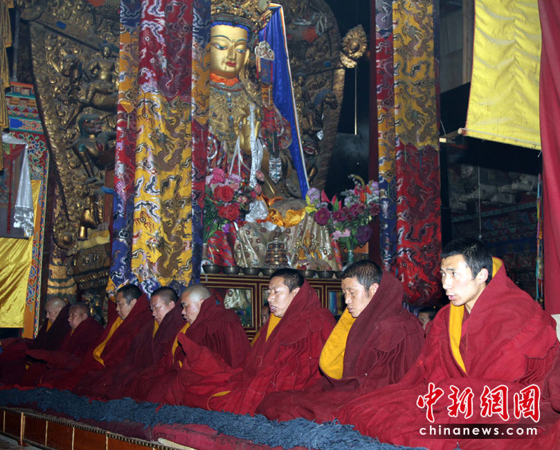 4月21日,全國哀悼日,拉薩大昭寺僧人在大殿誦經(jīng),為玉樹地震災區(qū)祈福。中新社發(fā) 徐長安 攝