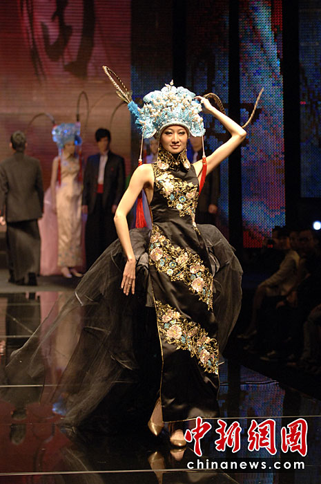 4月20日晚,首屆海西國際時裝周在福建石獅閉幕,本屆時裝周吸引了來自海峽兩岸的紡織服裝界企業(yè)家和知名服裝設計師。期間舉辦了12場時裝品牌和設計師作品動態(tài)發(fā)布會。圖為模特展示古今潮流結(jié)合的服裝。王東明 攝