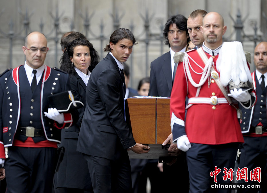 西班牙當(dāng)?shù)貢r(shí)間4月22日18時(shí),國際奧委會終身名譽(yù)主席薩馬蘭奇的葬禮在巴塞羅那舉行,包括西班牙國王夫婦、現(xiàn)任國際奧委會主席羅格、F1車手阿隆索、巴薩俱樂部主席等在內(nèi)的政界和體育界4000多人出席,網(wǎng)球名將納達(dá)爾等負(fù)責(zé)抬靈柩,送別薩翁最后一程。 圖為西班牙網(wǎng)球明星納達(dá)爾忍悲痛抬棺木。