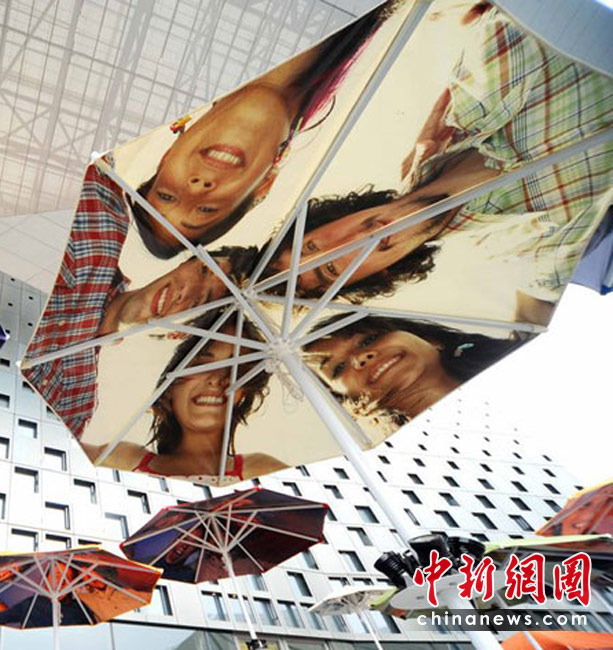 2010年4月22日,上海世博會(huì)主題館門前的觀眾等候區(qū),豎立著一把把遮陽(yáng)的花傘,每一把花傘上都印著四方友人的燦爛微笑。世博園區(qū)為了應(yīng)對(duì)大量客流,園區(qū)設(shè)置了大量遮陽(yáng)和避雨設(shè)施,遮陽(yáng)避雨面積總量達(dá)40萬(wàn)平方米。楊毅 攝