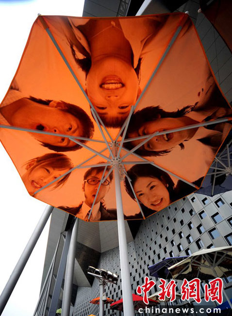 2010年4月22日,上海世博會主題館門前的觀眾等候區(qū),豎立著一把把遮陽的花傘,每一把花傘上都印著四方友人的燦爛微笑。世博園區(qū)為了應對大量客流,園區(qū)設置了大量遮陽和避雨設施,遮陽避雨面積總量達40萬平方米。楊毅 攝(CFP)