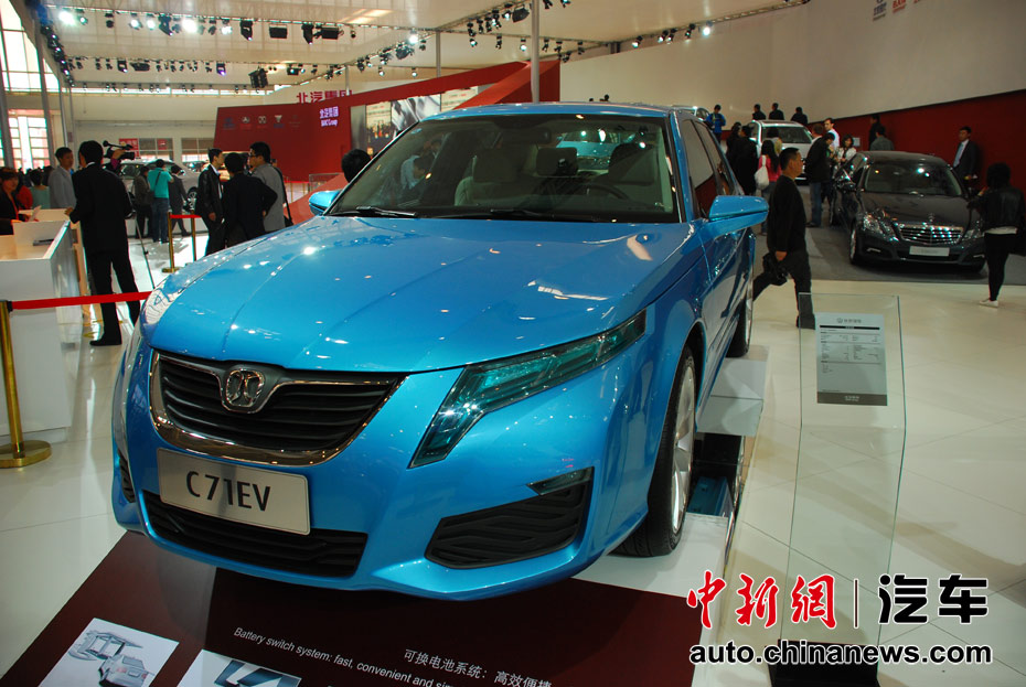 第十一屆北京國際車展23日開幕,在本屆以“暢想綠色未來”為主題的車展上,新能源車成為最大亮點(diǎn)。圖為北汽C71EV電動(dòng)車 王槊 攝
