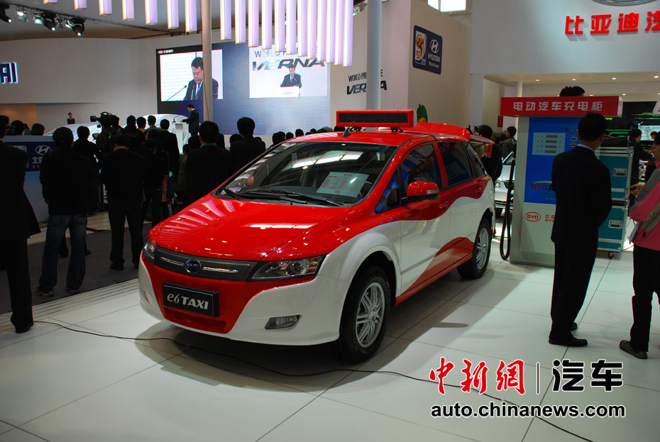 第十一屆北京國際車展23日開幕,在本屆以“暢想綠色未來”為主題的車展上,新能源車成為最大亮點。圖為比亞迪E6電動出租車 王槊 攝