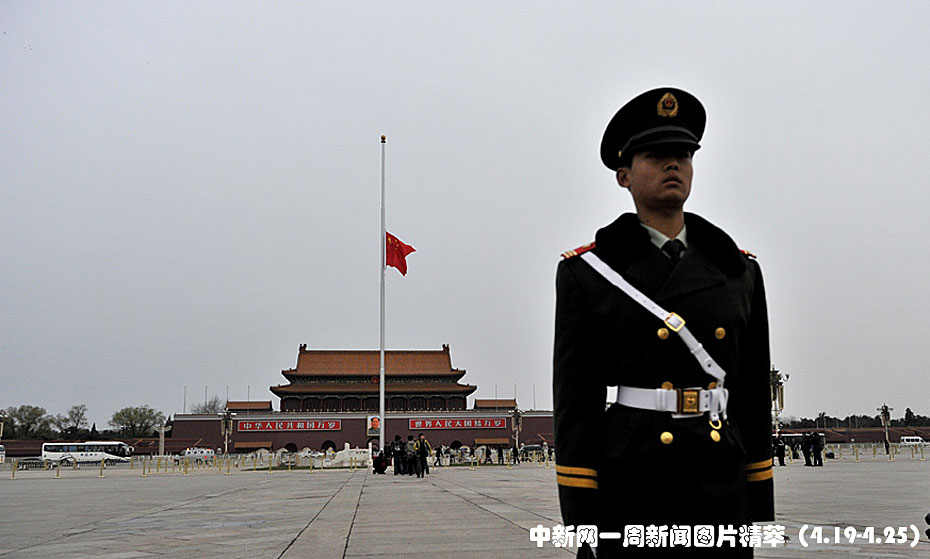 周三(21日),北京天安門廣場下半旗向玉樹地震遇難者致哀。