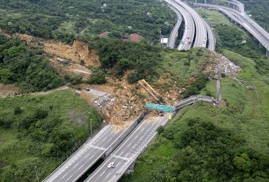 4月25日, 臺(tái)灣一條交通要道、“北二高”基隆段發(fā)生山崩意外,傾瀉而下的土石壓垮一座高架橋,并覆蓋道路約200米,據(jù)傳有人車被埋。(圖片來(lái)源:“中央社”)。