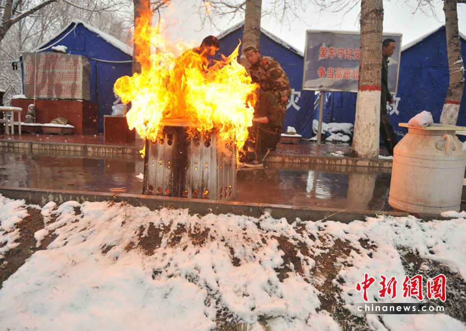 武警青海總隊玉樹支隊是最先投入抗震救災(zāi)的先鋒部隊,地震發(fā)生時恰逢部隊出操,營房嚴(yán)重受損而官兵平安無恙。這里立即成為抗震救災(zāi)的軍民和媒體的大本營之一,醫(yī)療救護(hù)隊和新型炊事車晝夜為軍民服務(wù)。集結(jié)在地震災(zāi)區(qū)的各路部隊從4月低之前全面轉(zhuǎn)入安置群眾和災(zāi)后重建,這里的的后勤已經(jīng)得到基本保障。 圖為武警新型炊事車?yán)脷饣癄t冒著雨雪為救援官兵和受災(zāi)民眾做飯。 中新社記者 賈國榮 攝