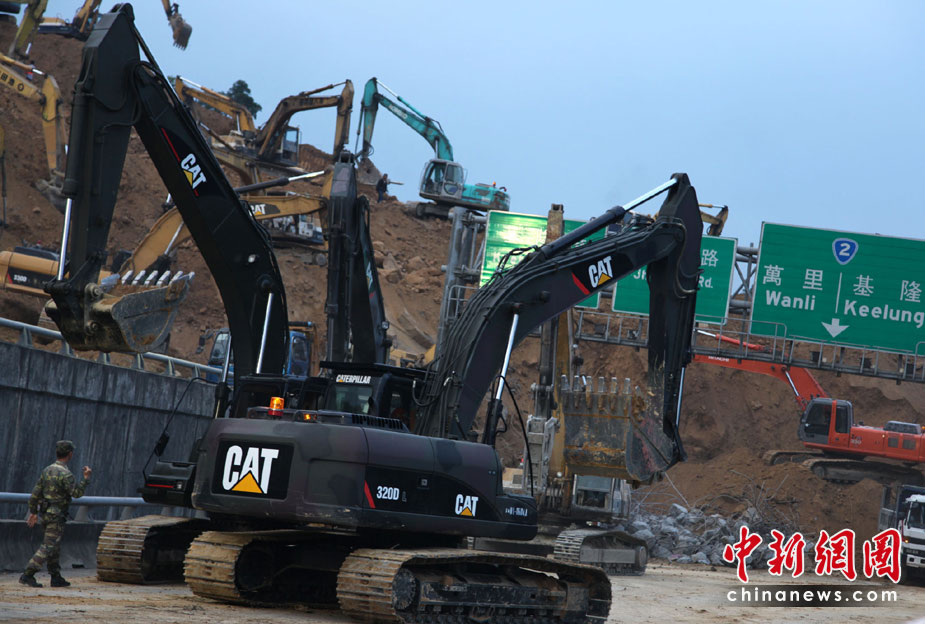 4月27日,臺灣“北二高”基隆段山體大滑坡意外第3天,開挖搜救風雨無阻、持續(xù)進行,消防部門陸續(xù)接獲民眾報告,疑似5車6人被深埋,包括兩輛奔馳轎車、一對年輕情侶。圖為軍方出動大型機械車參與挖掘工作。中新社發(fā) 董會峰 攝