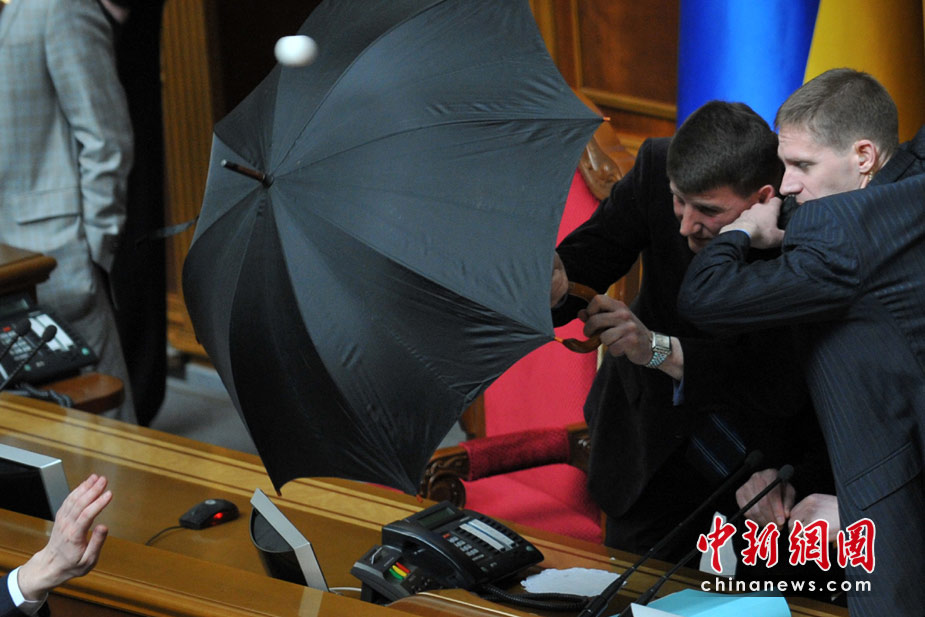 4月27日,基輔,烏克蘭議會(huì)就俄羅斯黑海艦隊(duì)駐扎問(wèn)題進(jìn)行討論時(shí)出現(xiàn)混亂,數(shù)千人在議會(huì)外示威,會(huì)場(chǎng)內(nèi)有人投擲煙霧彈和雞蛋,大廳內(nèi)煙霧彌漫,場(chǎng)面一度混亂。圖為議長(zhǎng)藏在傘后躲避不斷飛來(lái)的雞蛋。