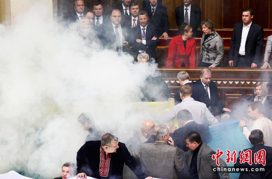 4月27日,基輔,烏克蘭議會(huì)就俄羅斯黑海艦隊(duì)駐扎問(wèn)題進(jìn)行討論時(shí)出現(xiàn)混亂,數(shù)千人在議會(huì)外示威,會(huì)場(chǎng)內(nèi)有人投擲煙霧彈和雞蛋,大廳內(nèi)煙霧彌漫,場(chǎng)面一度混亂。