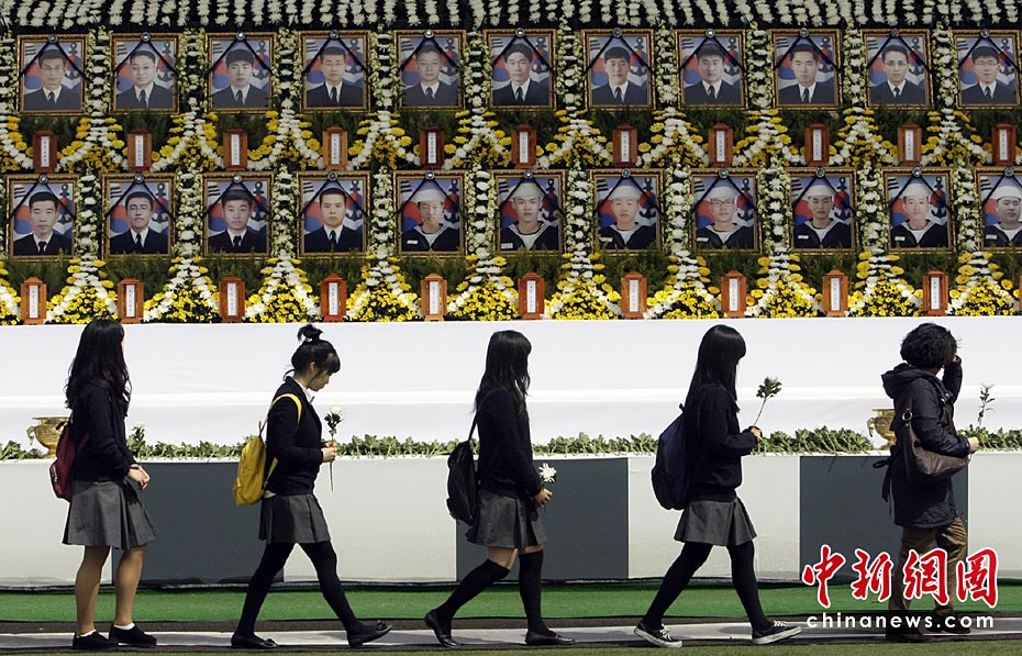 4月29日上午,韓國“天安”艦遇難官兵遺體告別儀式在平澤海軍第二艦隊司令部安保公園舉行。韓國總統(tǒng)李明博攜夫人參加告別儀式。圖片來源:中國新聞網(wǎng)