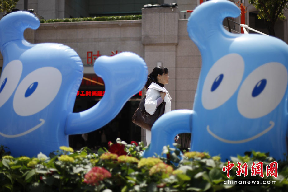 4月29日,上海街頭的世博會(huì)吉祥物海寶和行人。世博會(huì)開幕在即,面臨“大考”的上海充滿喜慶氣氛。 中新社發(fā) 廖攀 攝