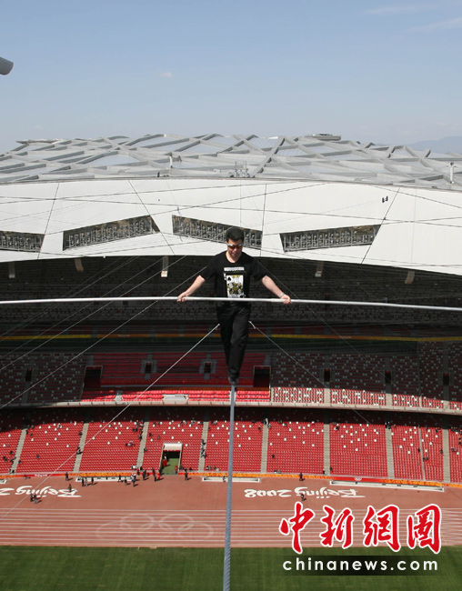 4月29日,有高空王子之稱的新疆小伙阿迪力在鳥巢上空成功試演達(dá)瓦孜(高空走鋼絲)。5月3日起,他將在北京國家體育場(鳥巢)頂棚上搭建的小屋生存60天,其間每天將進(jìn)行約5個(gè)小時(shí)的高空走鋼絲表演。 中新社發(fā) 蘇丹 攝
