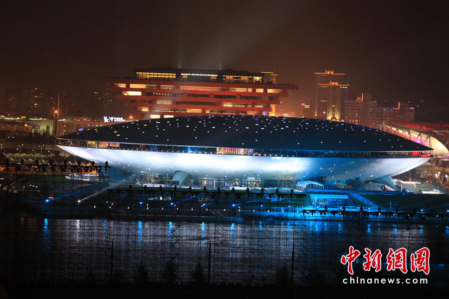 2010年4月29日晚,世博會(huì)開幕式主場館世博文化中心、世博會(huì)開園儀式主場館世博中心夜景燈光開放,迎接4月30日開幕慶典和5月1日開園儀式舉行。屠知力 攝